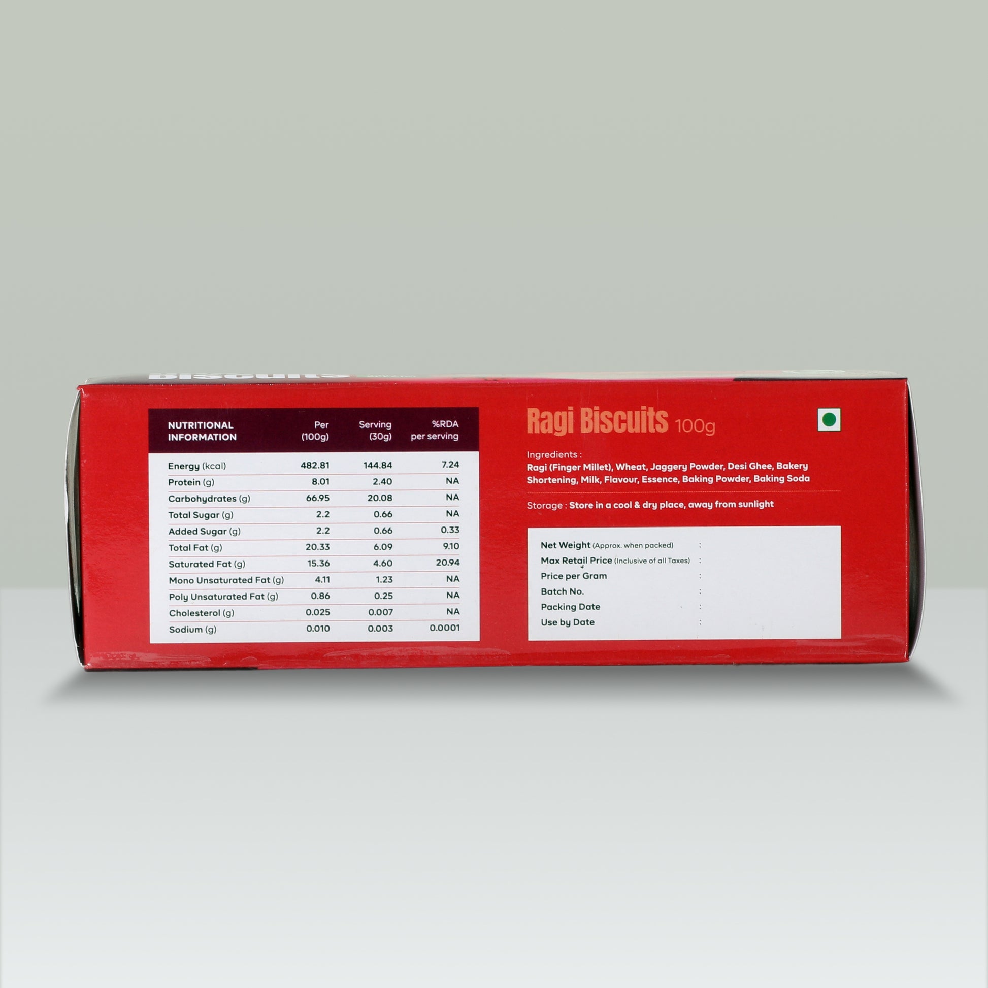 Ingredients: Ragi(Finger Millet), Wheat, Jaggery Powder, Desi Ghee, Bakery Shortening, Milk, Flavour, Essence, Baking Powder, Baking Soda